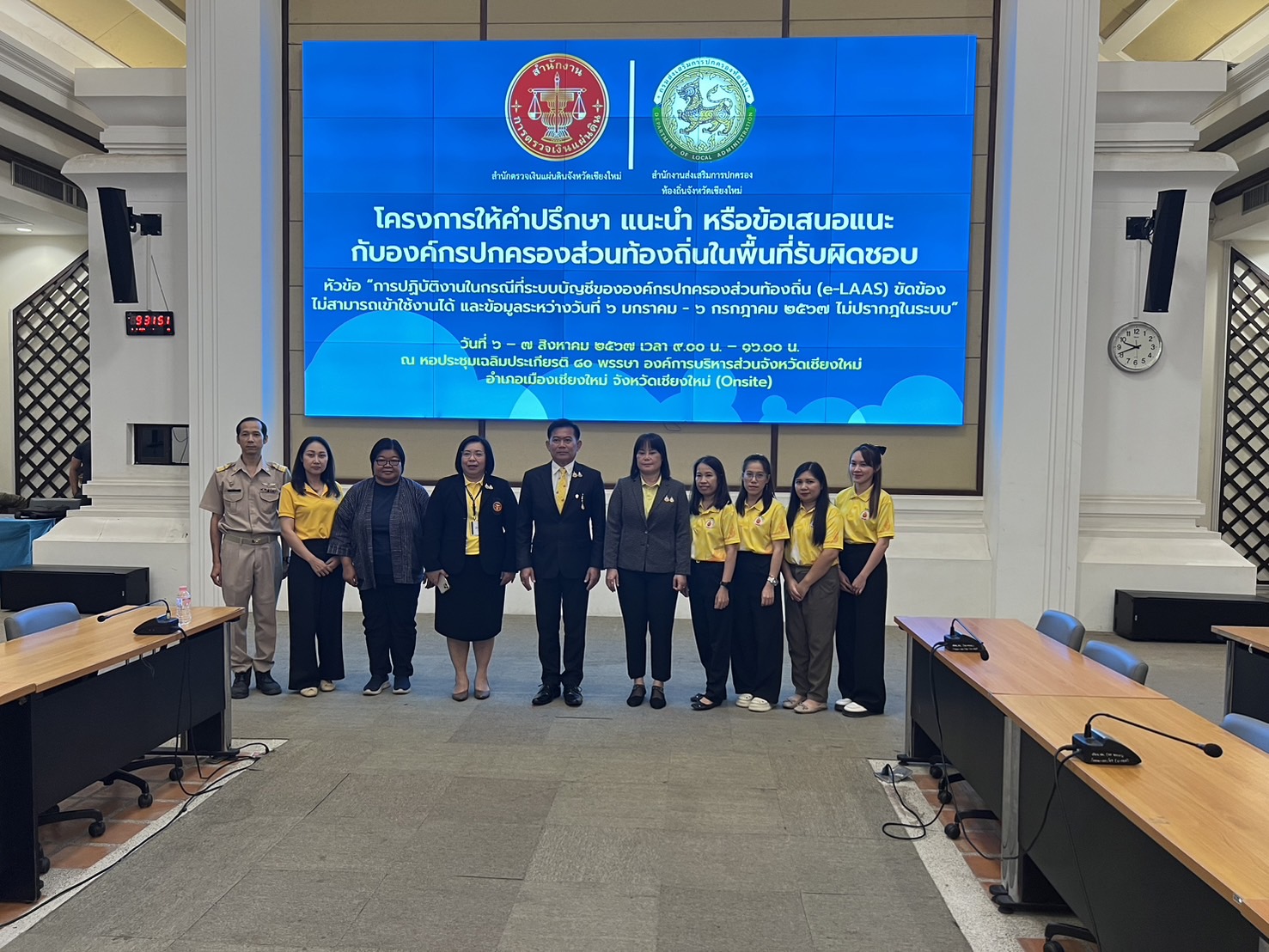 สำนักงานส่งเสริมการปกครองท้องถิ่นจังหวัดเชียงใหม่ ร่วมกับสำนักงานการตรวจเงินแผ่นดินจังหวัดเชียงใหม่ ได้จัดโครงการให้คำปรึกษา แนะนำ หรื่อข้อเสนอแนะเกี่ยวกับการบันทึกข้อมูลในระบบบัญชีคอมพิวเตอร์ขององค์กรปกครองส่วนท้องถิ่น (e - LAAS) ที่ขัดข้องไม่สามารถเข้าใช้งานได้ และข้อมูลระหว่างวันที่ 6 มกราคม - 6 กรกฎาคม 2567 ไม่ปรากฎในระบบ ให้กับองค์กรปกครองส่วนท้องถิ่นในพื้นที่จังหวัดเชียงใหม่ ระหว่างวันที่ 6 - 7 สิงหาคม 2567 ณ ห้องประชุมเฉลิมพระเกียรติ 80 พรรษา องค์การบริหารส่วนจังหวัดเชียงใหม่ อำเภอเมืองเชียงใหม่ จังหวัดเชียงใหม่