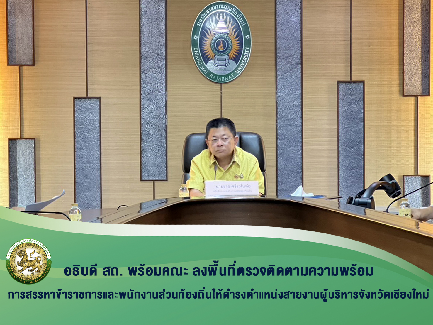 วันที่ 18 ตุลาคม 2567 ณ มหาวิทยาลัยราชภัฏเชียงใหม่ นายขจร ศรีชวโนทัย อธิบดีกรมส่งเสริมการปกครองท้องถิ่น พร้อมด้วยพันจ่าเอกสาคร สิทธิศักดิ์ ผู้อำนวยการสำนักพัฒนาระบบบริหารงานบุคคลส่วนท้องถิ่น, นายปิยะ คังกัน ผู้เชี่ยวชาญเฉพาะด้านบริหารงานบุคคลท้องถิ่น, นางสาวบุรณี แพรโรจน์ ผู้อำนวยการกลุ่มงานสรรหาและเลือกสรรบุคคลส่วนท้องถิ่น และคณะจากกรมส่งเสริมการปกครองท้องถิ่น ตรวจติดตามความพร้อมการดำเนินการสรรหาข้าราชการและพนักงานส่วนท้องถิ่นให้ดำรงตำแหน่งสายงานผู้บริหารของจังหวัดเชียงใหม่ โดยมีนายดำรงค์ เมืองมูล ผู้อำนวยการกลุ่มงานมาตรฐานการบริหารงานบุคคลส่วนท้องถิ่น พร้อมด้วยผู้อำนวยการกลุ่มงาน และคณะจากสำนักงานส่งเสริมการปกครองท้องถิ่นจังหวัดเชียงใหม่ ให้การต้อนรับ