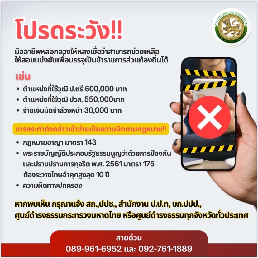 โปรดระวังมิจฉาชีพหลอกลวงให้หลงเชื่อว่าสามารถช่วยเหลือให้สอบแข่งขันฯหากพบเห็น กรุณาแจ้งสายด่วน 089-9616952 และ 092-7611889