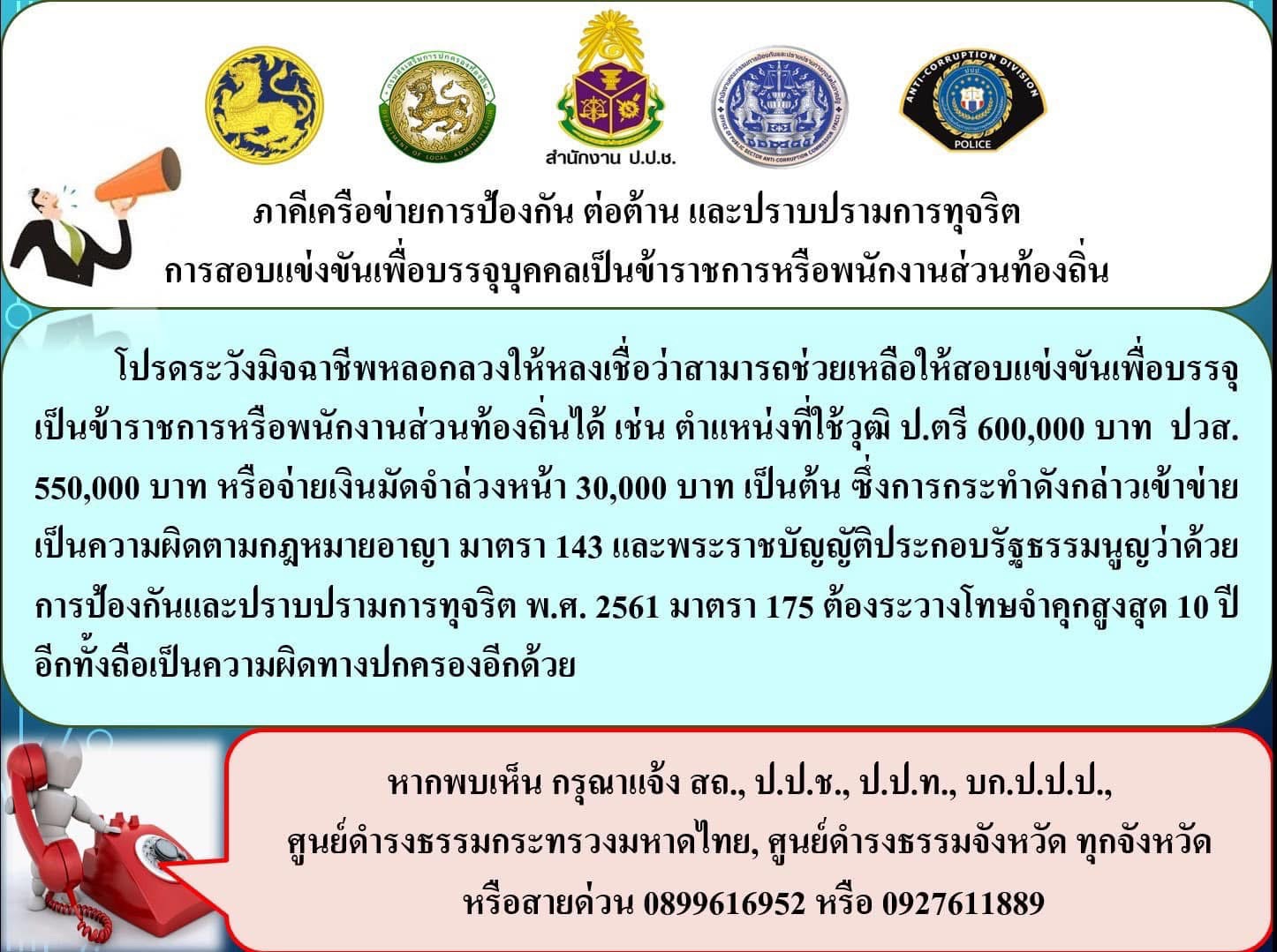 โปรดระวังมิจฉาชีพหลอกลวงให้หลงเชื่อว่าสามารถช่วยเหลือให้สอบแข่งขันฯ หากพบเห็น กรุณาแจ้งสายด่วน 089-9616952 และ 092-7611889